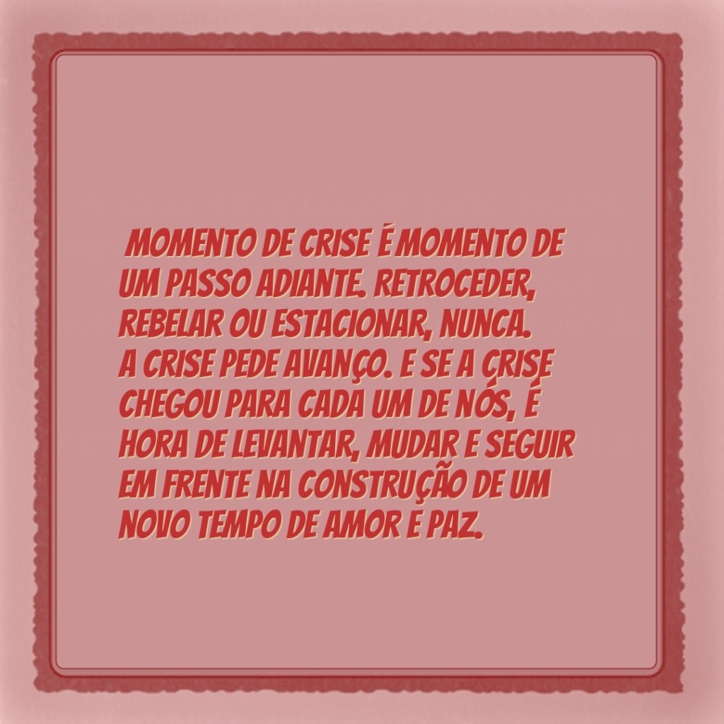 Momento de crise é momento de um passo adiante. Retroceder, rebelar ou estacionar, nunca. A crise pede avanço. E se a crise chegou para cada um de nós, é hora de levantar, mudar e seguir em frente na construção de um novo tempo de amor e paz.