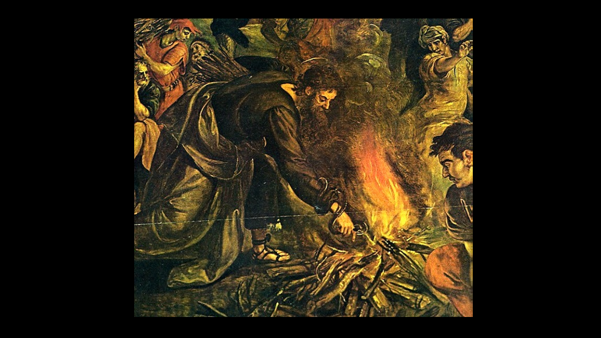 Grandes fogueiras foram acesas rapidamente , mas, quando o Apóstolo atirava um feixe de ramos secos à labaredas crepitante, uma víbora cravou-lhe nas mãos os dentes venenosos. O ex-rabino susteve-a no ar com gesto sereno, até que ela caísse nas chamas, com estupefação geral.